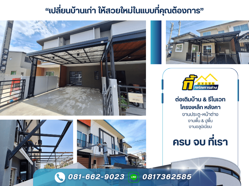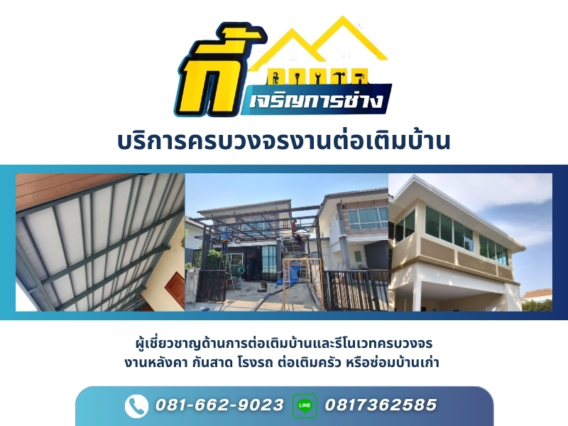 บต่อเติมบ้านครบวงจร โดยทีมงานมืออาชีพ | กี้ เจริญการช่าง หากคุณกำลังมองหาบริการ รับต่อเติมบ้านครบวงจร ที่สามารถดูแลทุกขั้นตอนตั้งแต่การวางแผน ออกแบบ ไปจนถึงการก่อสร้างจริง ทีมงาน กี้ เจริญการช่าง คือคำตอบที่ใช่สำหรับคุณ เพราะเรามีช่างผู้เชี่ยวชาญที่มากด้วยประสบการณ์กว่า 10 ปี พร้อมให้บริการงานช่างทุกประเภท ไม่ว่าจะเป็น ต่อเติมครัวหลังบ้าน ทำหลังคาโรงรถ ติดตั้งกันสาด ต่อเติมห้องนอน ห้องน้ำ รีโนเวทบ้านเก่าให้เหมือนใหม่ ทุกงานของเราใส่ใจทุกรายละเอียด ใช้วัสดุคุณภาพ มาตรฐานงานช่าง เน้นความแข็งแรง ทนทาน และที่สำคัญคือราคาคุ้มค่า พร้อมบริการหลังการขายที่สร้างความมั่นใจให้ลูกค้าทุกท่าน